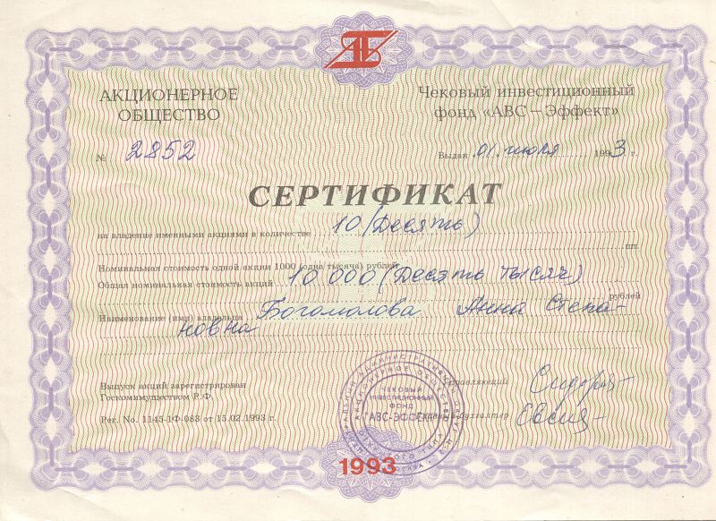 1. Дата начала размещения эмиссии – 15 февраля 1993 года, дата окончания размещения эмиссии – 1 октября 1997 года. 2. Номинальная стоимость каждой ценной бумаги - 1000 ( Одна тысяча ) рублей без учета деноминации 1998 г. 3. Общее количество размещенных путем открытой подписки ценных бумаг составило 900000 (девятьсот тысяч) штук. В том числе: - оплачено денежными средствами и приватизационными чеками 150058 (сто пятьдесят тысяч пятьдесят восемь) акции; - оплачено за счет дивидендов по заявлениям акционеров - 26973 (двадцать шесть тысяч девятьсот семьдесят три) акции; - оплачено путем обмена на акции других предприятий- 95000 (девяносто пять тысяч) акций. - начислено за счет нераспределенной прибыли прошлых лет и добавочного капитала - 627969 (шестьсот двадцать семь тысяч девятьсот шестьдесят девять) акций. Начисление акций за счет нераспределенной прибыли и добавочного капитала проводилось пропорционально количеству акций, принадлежащих акционерам, во исполнение решений, принятых общими собраниями акционеров. 4. Цена размещения 898730 (восьмисот девяносто восьми тысяч семисот тридцати) акций составляла 1 рубль (1000 неденоминированных рублей), 1270 (одна тысяча двести семьдесят) акций было продано по 2 (2000) рубля. 5. В оплату за размещенные акции Фондом получено: а) денежных средств и имущества на общую сумму 901270 (девятьсот одна тысяча двести семьдесят) рублей; б) в том числе 57878 (пятьдесят семь тысяч восемьсот семьдесят восемь) рублей – денежными средствами; в) 26973 (двадцать шесть тысяч девятьсот семьдесят три) рубля – дивиденды акционеров; г) оплата акций иностранной валютой не производилась; д) на 95000 (девяносто пять тысяч) рублей оплата акций была произведена обыкновенными именными акциями других предприятий (чековых инвестиционных фондов); е) приватизационными чеками оплачено акций на 93450 (девяносто три тысячи четыреста пятьдесят) рублей; ж) за счет нераспределенной прибыли и добавочного капитала оплачено 627969 (шестьсот двадцать семь тысяч девятьсот шестьдесят девять) рублей. 6. В проспекте эмиссии не предусмотрена доля акций, при неразмещении которой выпуск признается несостоявшимся. 7. Выпуск ценных бумаг размещен полностью. 8. Сумма эмиссионного дохода составила 1270 (одну тысячу двести семьдесят) рублей. 9. а) Акционеры, владеющие не менее, чем 5 процентами акций: “Компания АВС” - 165000 (сто шестьдесят пять тысяч) акций - 18,3 %. б) Члены совета директоров: Председатель - Бутримов Андрей Викторович - 6476 акций (0,72 %); Генеральный директор ОАО “Компания АВС”; Долгова Ольга Владимировна - 192 акции (0,02 %); Финансовый директор ОАО ”Компания АВС”; Жуков Олег Юрьевич - акциями лично не владеет; Управляющий ОАО ЧИФ “Мясная промышленность”; Пономарева Нина Алексеевна - 450 акций (0,05%); Главный бухгалтер ОАО “Компания АВС”; Сидорова Наталья Ивановна - 2630 акций (0,29 %); Финансовый директор Института экономики энергетики; Хозинская Галина Александровна- 404 акции (0,04 %); директор управляющей компании ОАО ЧИФ “АВС-Эффект”; Трутенко Василий Александрович – лично акциями не владеет, директор Компании “Базиль и Ко”. в) В качестве исполнительного органа ОАО ЧИФ”АВС-Эффект” действует управляющая компания ТОО “КМ-Альянс” (Лицензия ГКИ № 269 от 03.04.95 г.; Договор об управлении № б/н от 01.06.95г. ), не владеющая акциями ЧИФ”АВС-Эффект”.