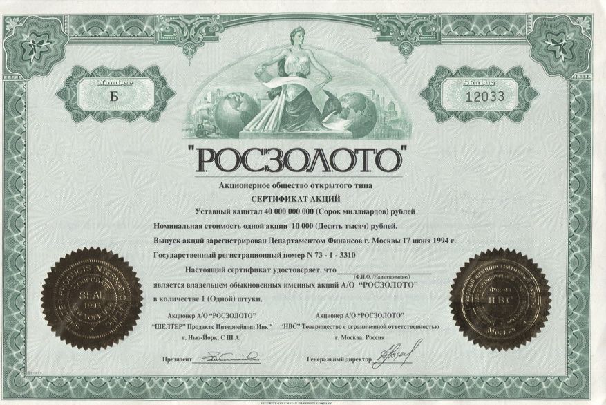 Эмиссия акций осуществлена "Росзолотом" на номинальную сумму в 40 млрд рублей. Однако уже сейчас балансовая стоимость только деревоперерабатывающих комбинатов (контрольные пакеты их акций принадлежат компании) превышает эту цифру. Первичное размещение акций "Росзолота" закончено. Контрольный пакет — это примерно 35% акций — принадлежит самой компании. Держателем почти всех остальных акций АООТ стало специально для этого образованное АОЗТ "Инвестиционная компания 'Росзолото'", которое сейчас ведет двустороннюю котировку акций, осуществляет их вторичную продажу и скупку.
