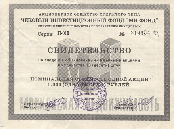 В самом деле, многие москвичи, обменявшие в начале 90-х свои ваучеры на акции «Московской недвижимости», с тех пор ничего не слышали ни о компании, ни о дивидендах. Корреспондент «ЗБ» выяснил, что акционерный фонд «Московская недвижимость» никуда не делся. Компания просто сменила название: в 1993 году она носила название АООТ «Чековый инвестиционный фонд «Московская недвижимость», с 1997 года — ОАО «ЧИФ «МН-фонд», а в 1998 году было принято решение преобразовать его в Открытое акционерное общество «МН-фонд». В результате деноминации, проведенной правительством РФ в 1998 году, стоимость всех акций была уменьшена в тысячу раз. Таким образом, номинальная стоимость одной акции ОАО «МН-фонд» составляет сегодня 1 рубль. На сумму акции фонд ежегодно начисляет дивиденды, узнать о порядке получения которых можно по адресу: Малый Харитоньевский пер., 8. (проезд до станции метро «Чистые пруды» или «Тургеневская»,679-14-98 ). Офис во дворе под вывеской «Премиум Групп» (так называется трансфер-агентство, через которое и осуществляются выплаты). Выплаты акционерам производятся почтовым электронным переводом по месту жительства акционера на основании его письменного заявления в утвержденной форме. Письменное заявление направляется по адресу: 115407, Москва, а/я 109. Правда, дивиденды невелики: за 2007 год на каждую акцию было начислено 20 копеек, а в 2006 году — 10 копеек. Продать эти акции не так просто: «МН-фонд» не собирается выкупать их у населения. Правда, в Интернете на «электронных барахолках» за них дают до 100 рублей за штуку.