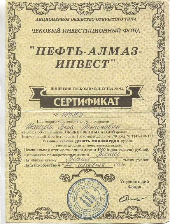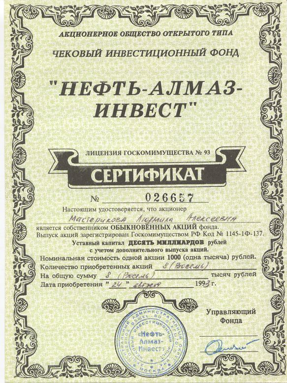 Решением Арбитражного суда города Москвы от 29.07.1998 ОАО «Инвестиционный фонд «Нефть-Алмаз-Инвест» (прежнее наименование – АООТ ЧИФ «Нефть-Алмаз-Инвест») признано несостоятельным (банкротом) и в отношении него было открыто конкурсное производство. Конкурсным управляющим фонда назначен Черновалов П. В. Ликвидационная комиссия (конкурсное производство) работала по адресу: г. Москва, ул. Бабаевская, д. 6. Требования о включении в список кредиторов и претензии участников (акционеров) принимались конкурсным управляющим ОАО «ИФ «Нефть-Алмаз-Инвест» до 15.12.2000. Определением Арбитражного суда города Москвы от 15.12.2000 конкурсное производство, открытое в отношении ОАО«ИФ «Нефть-Алмаз-Инвест», завершено. Согласно свидетельству Московской регистрационной палаты, выданному 18.01.2001, зарегистрирована ликвидация и прекращение деятельности ОАО «ИФ «Нефть-Алмаз-Инвест».