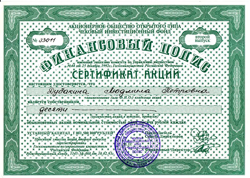 По сведениям Федерального общественно-государственного фонда по защите прав вкладчиков и акционеров АООТ ЧИФ "Финансовый полис" в 1999 году присоединен к АООТ ЧИФ "Афганец". АООТ ЧИФ "Афганец" переименован в ОАО "Афганец" и продолжает свою деятельность. Адрес места нахождения компании: 125171, Москва, ул. Зои и Александра Космодемьянских, д.8, Академия МВД. Почтовый адрес: 125171, Москва, а/я 57. Тел. (495) 156-92-90. Адрес страницы в сети Интернет: http://www.afgacomp.ru. По сведениям из ежеквартального отчета общества, представленного за 2 квартал 2012 года, лицом, осуществляющее ведение реестра владельцев именных ценных бумаг эмитента, является ЗАО «Компьютершер Регистратор». Место нахождения: 121108 г. Москва, ул. Ивана Франко, д.8 , Бизнес-центр «Kutuzoff Tower». Почтовый адрес:121108 г. Москва, ул. Ивана Франко, д.8 Тел.: (495) 926-81-60 Факс: (495) 926-81-78. Адрес электронной почты: info@nrcreg.ru .">info@nrcreg.ru. Адрес страницы регистратора в сети Интернет: www.nrcreg.ru.