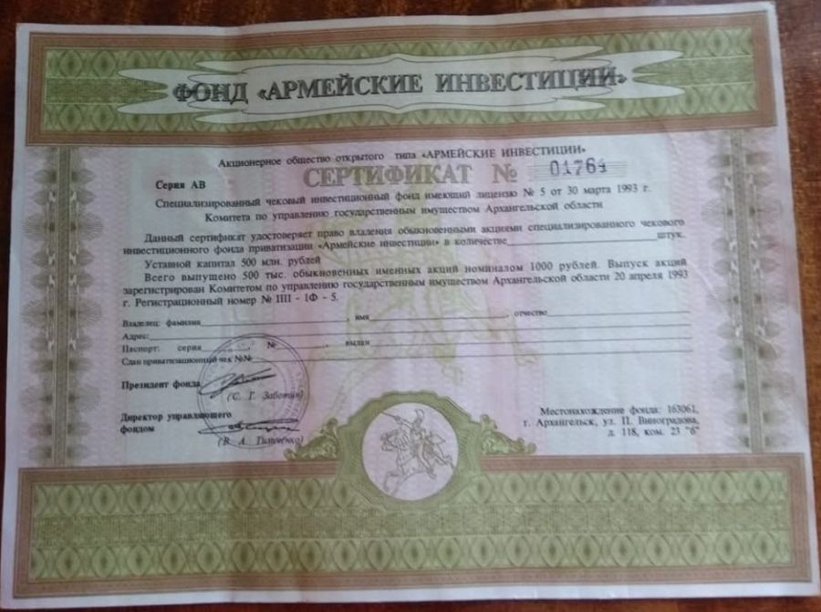 ОАО "АРМЕЙСКИЕ ИНВЕСТИЦИИ" Специализированный чековый инвестиционный фонд имеющий лицензию №5 от 30 марта 1993 г. Комитета по управлению государственным имуществом Архангельской области. Адрес: г. Архангельск ул. Ленина пл., 4, оф.508 Телефон компании:(8182)653932
