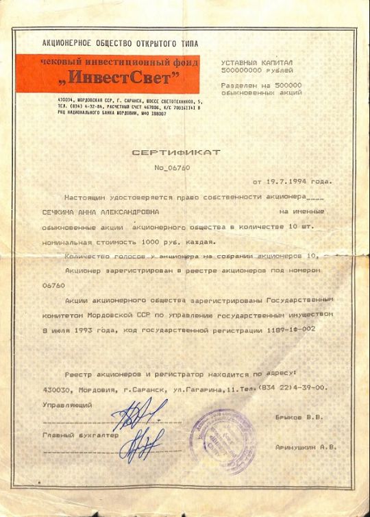 Свидетельство о внесении записи в Единый государственный реестр юридических лиц серия 13 №000731723 выдано Инспекцией МНС России по Ленинскому району г. Саранска Республики Мордовия. Дата внесения записи 15 октября 2002 г. за основным государственным регистрационным номером 1021300976806.