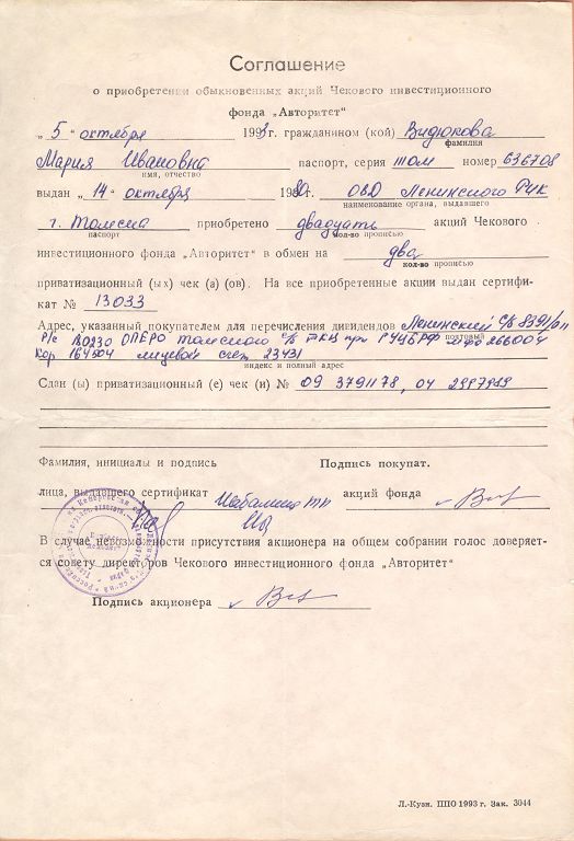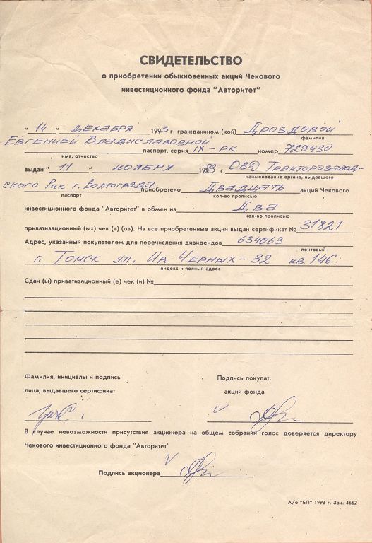 АООТ Чековый инвестиционный фонд «Авторитет» реорганизовано в открытое акционерное общество «Авторитет» в соответствии с решением общего собрания акционеров от 25.04.1996 и сменил местонахождение на 634029, г. Томск, ул. Белинского, д. 8. Почтовый адрес: 634009, г. Томск, пер. Совпартшкольный, д. 12. Тел. (3822) 51-47-09, 51-36-14 51-47-09. В 2006 году Общество переехало на новый адрес: 649002, Респ Алтай , г Горно-Алтайск , ул Титова , 36/2 ИНН 4212003177.