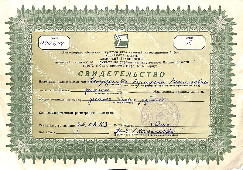 АО открытого типа чековый инвестиционный фонд социальной защиты "Высокие технологии", имеющий лицензию №1 Комитета по управлению имуществом Омской области.