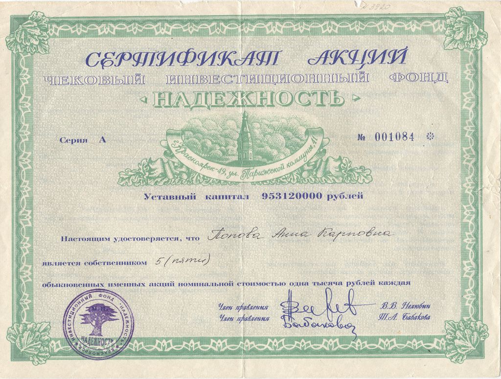 АООТ ЧИФ «Надежность» было зарегистрировано в мае 1993 г. и находилось по адресу: 660075, Красноярский край, г. Красноярск, ул. Маерчака, д. 40, оф. 403. В соответствии с Указом Президента РФ от 23.02.98 № 193 «О дальнейшем развитии деятельности инвестиционных фондов» общество было преобразовано в ОАО «Надежность». Нам не удалось обнаружить какую-либо отчетность о работе общества после 1998 г., скорее всего тогда ОАО «Надежность» и прекратило всякую видимую деятельность. Между тем в ЕГРЮЛ нет информации об официальном прекращении деятельности общества или же преобразовании.